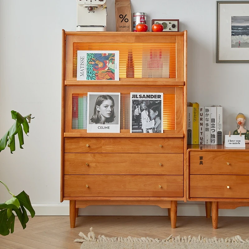 雲雲佳美の無垢材書棚、防塵機能付きのチェリーウッドカラー!日本風デザインの家庭用書斎用書架、ガラス扉付きのコンビネーションでスタイリッシュに収納!