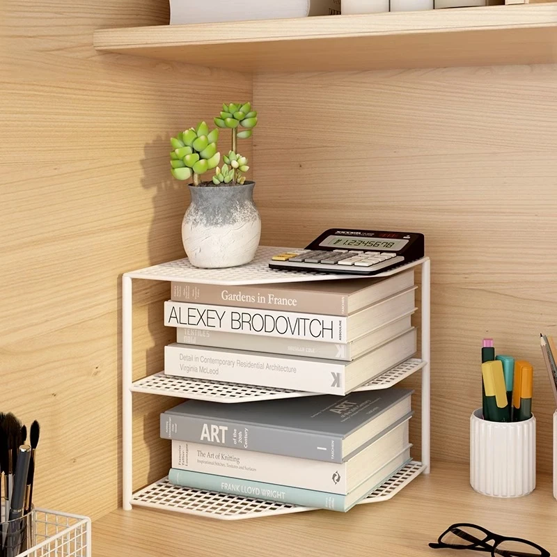 "Corner Desk Organizer - Double-Layer Bookshelf and Document Holder for Office Desks, Perfect for Efficient Workspace Storage and Stylish Organization"
