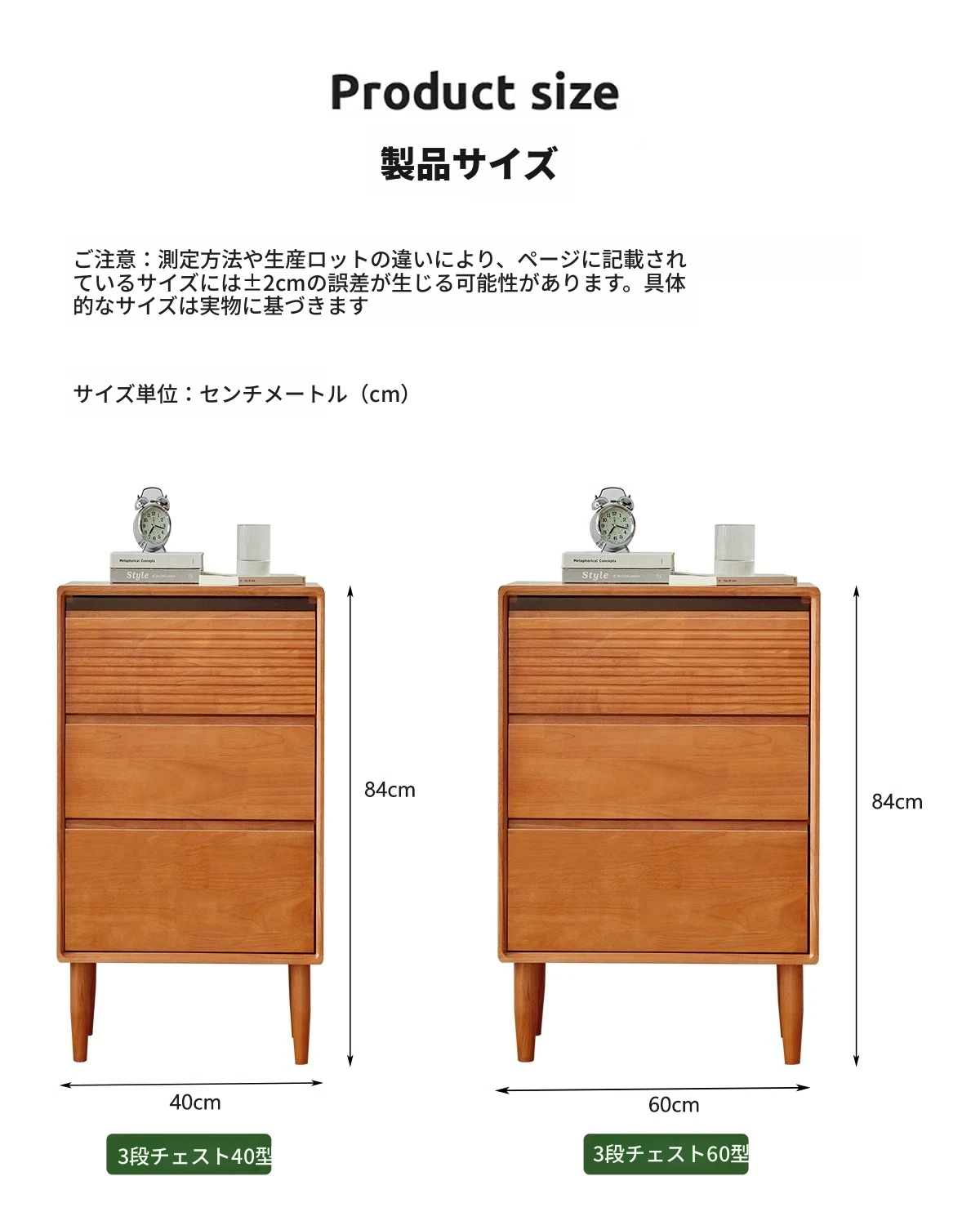 【ナチュラルウッドカラー】無垢材の三段チェスト 40スリム