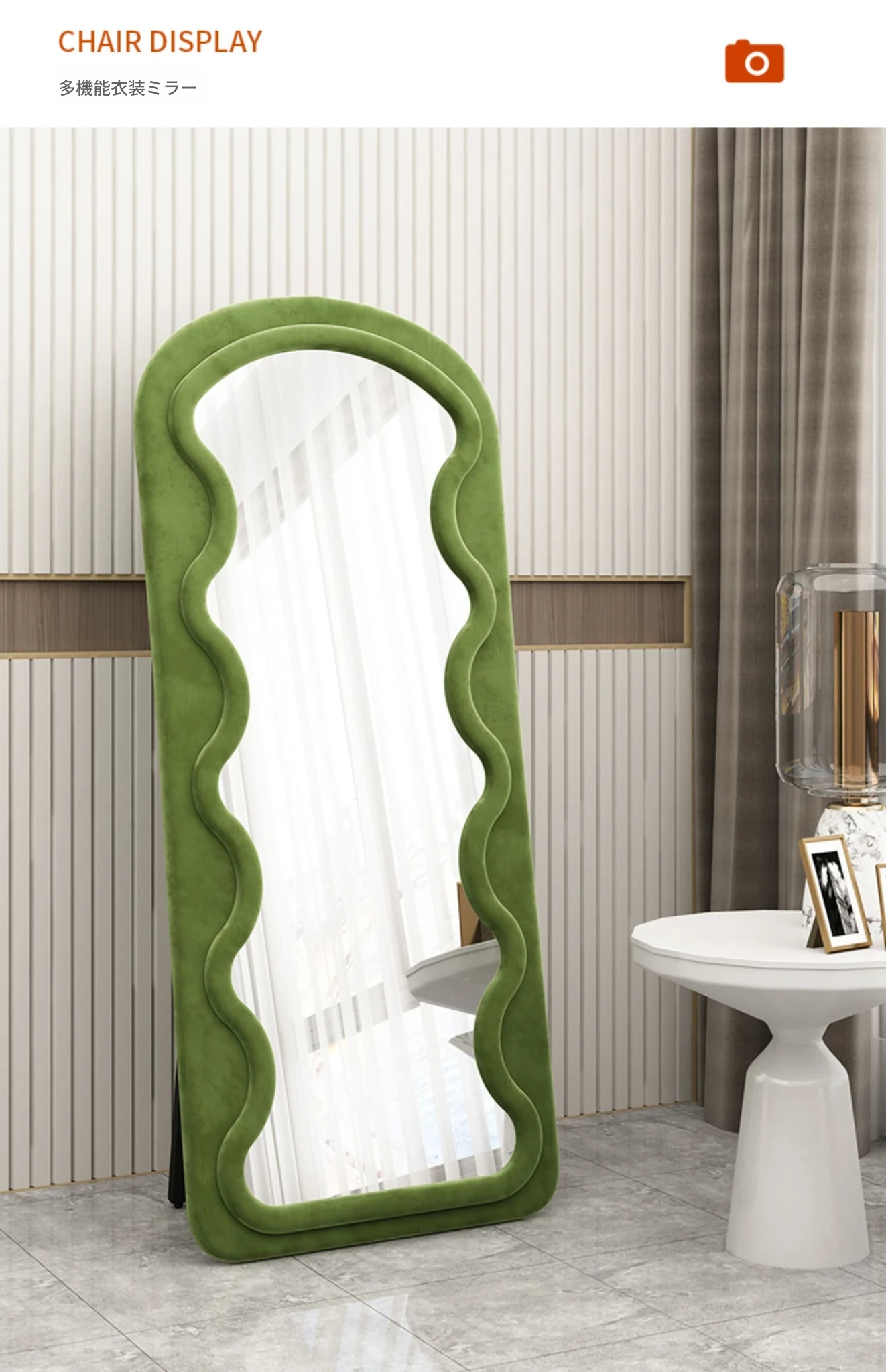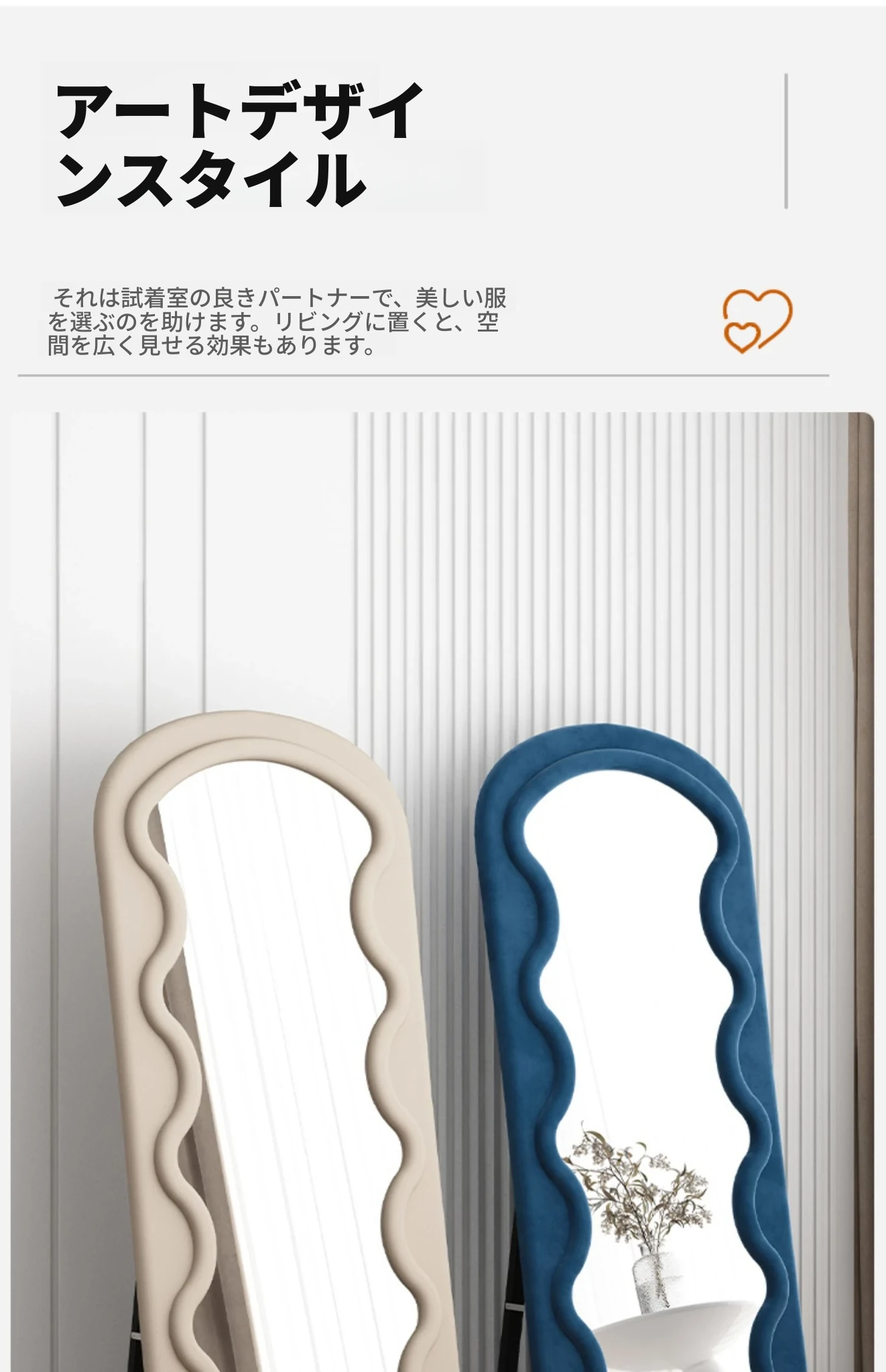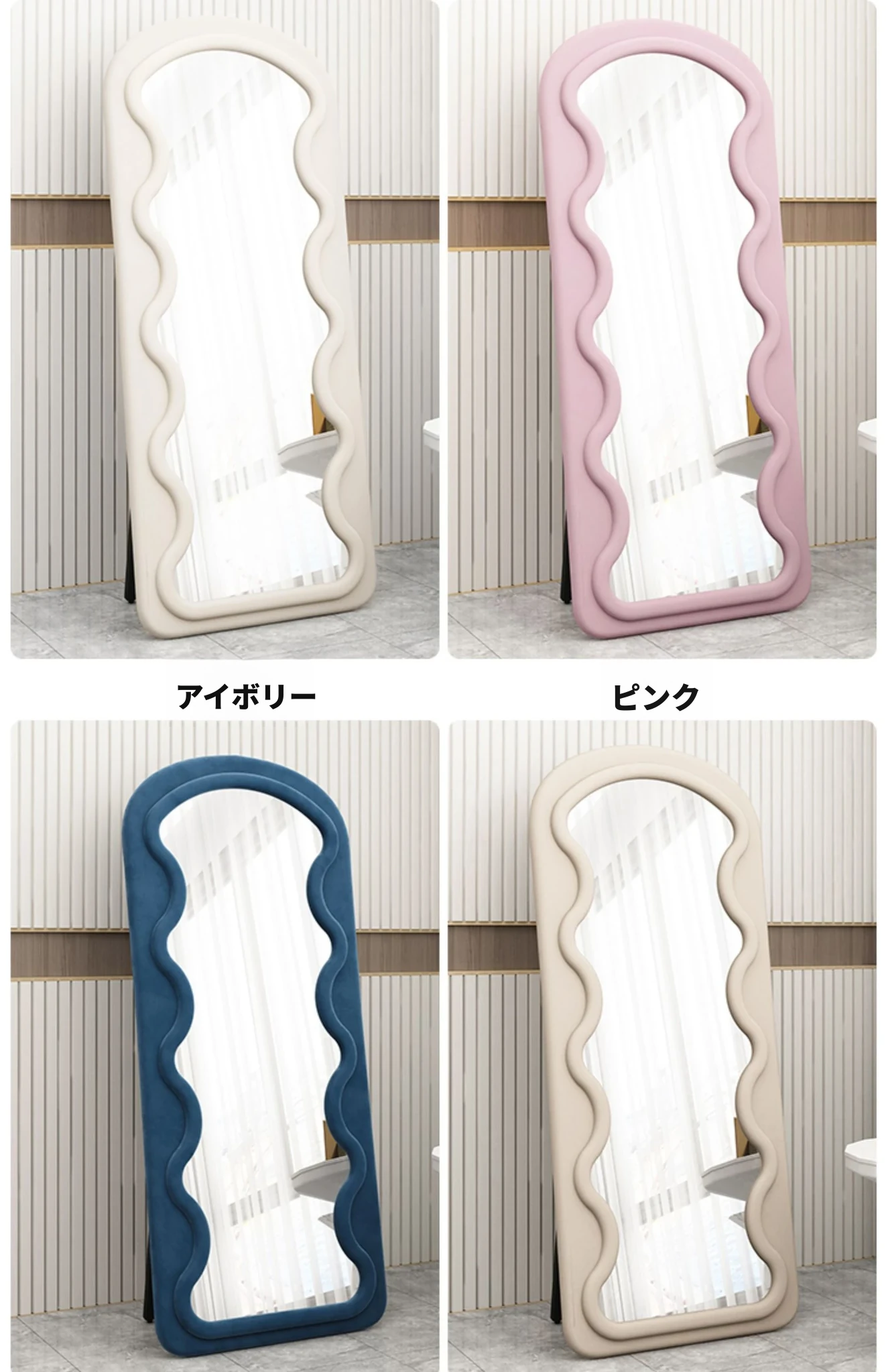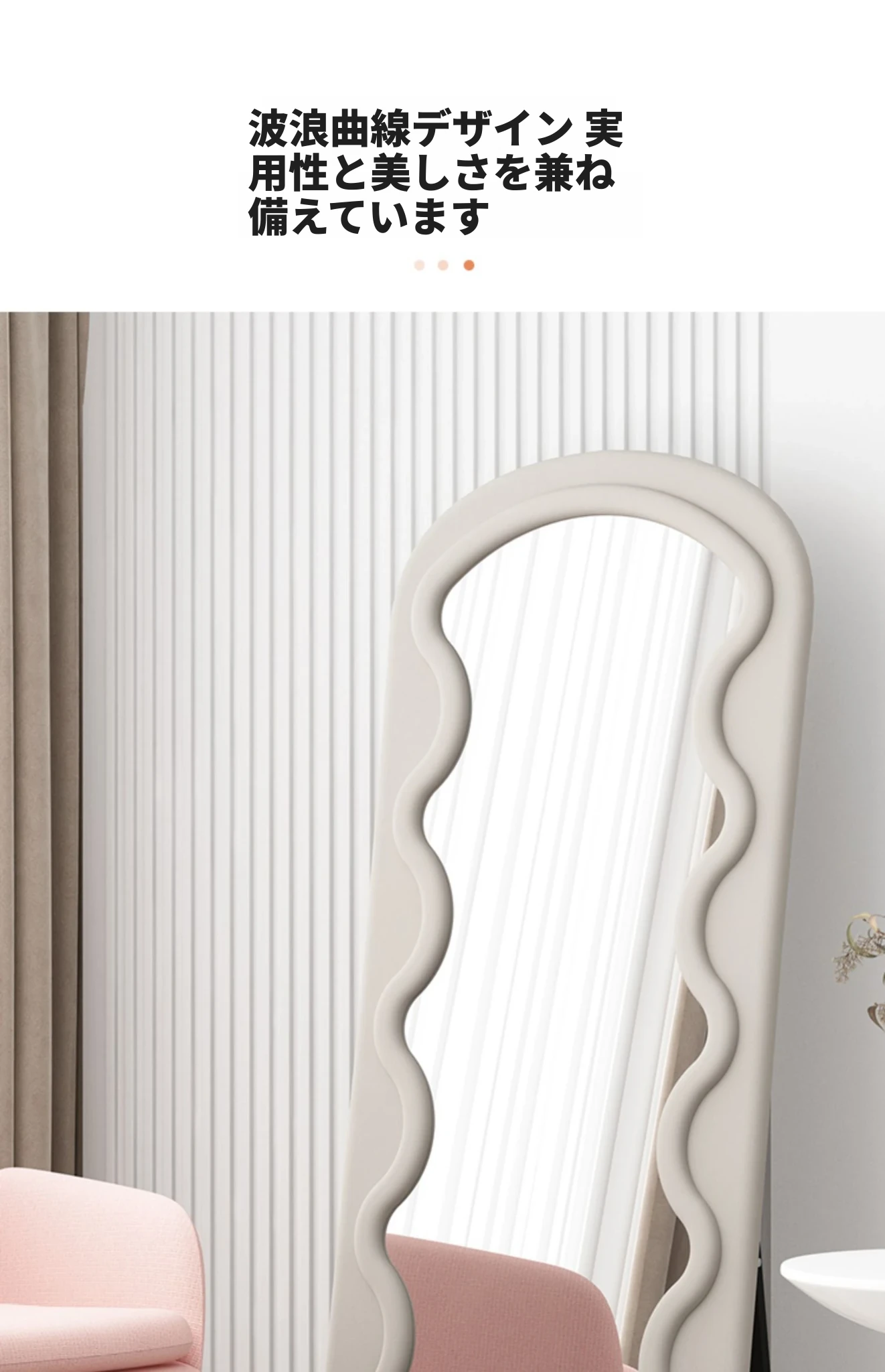 おしゃれな波浪デザインの全身鏡!自宅用のスタンドタイプで、女性のメイクやコーディネートにぴったり。壁に寄せて使えるユニークな形状で、衣類店の試着にも最適です。あなたの美しさを引き立てるアイテム!