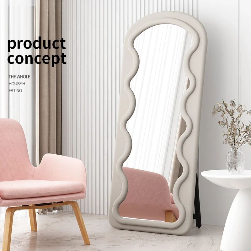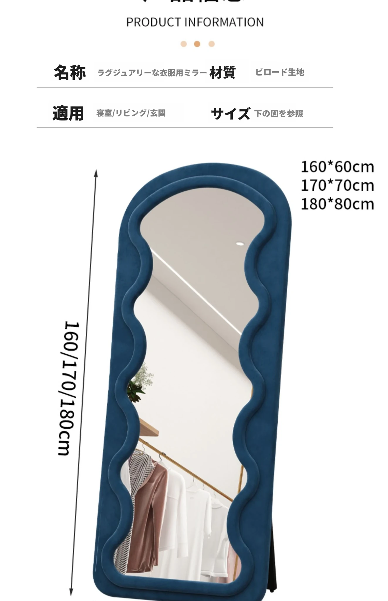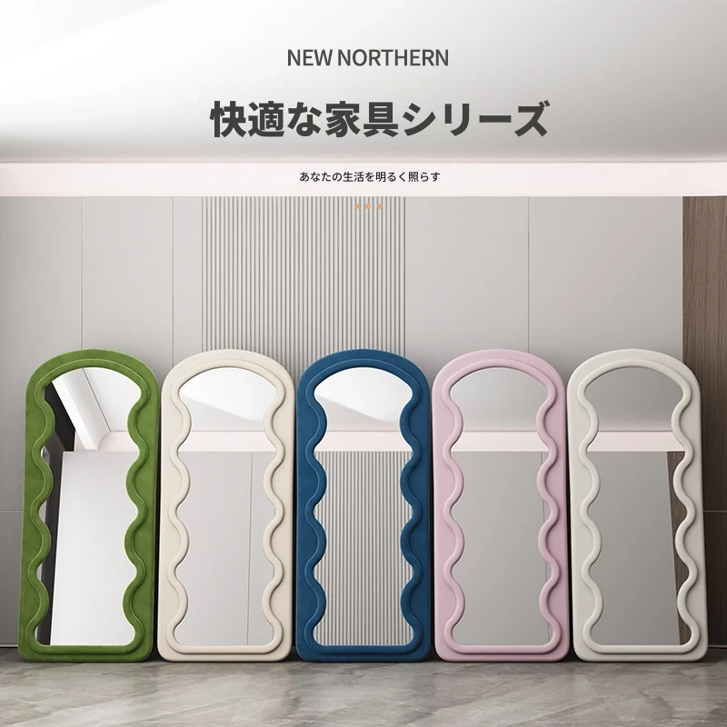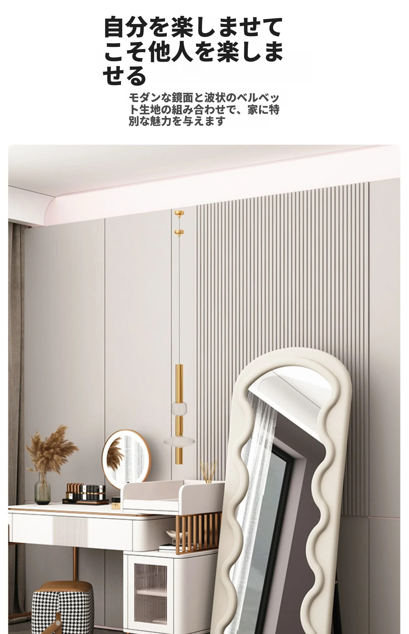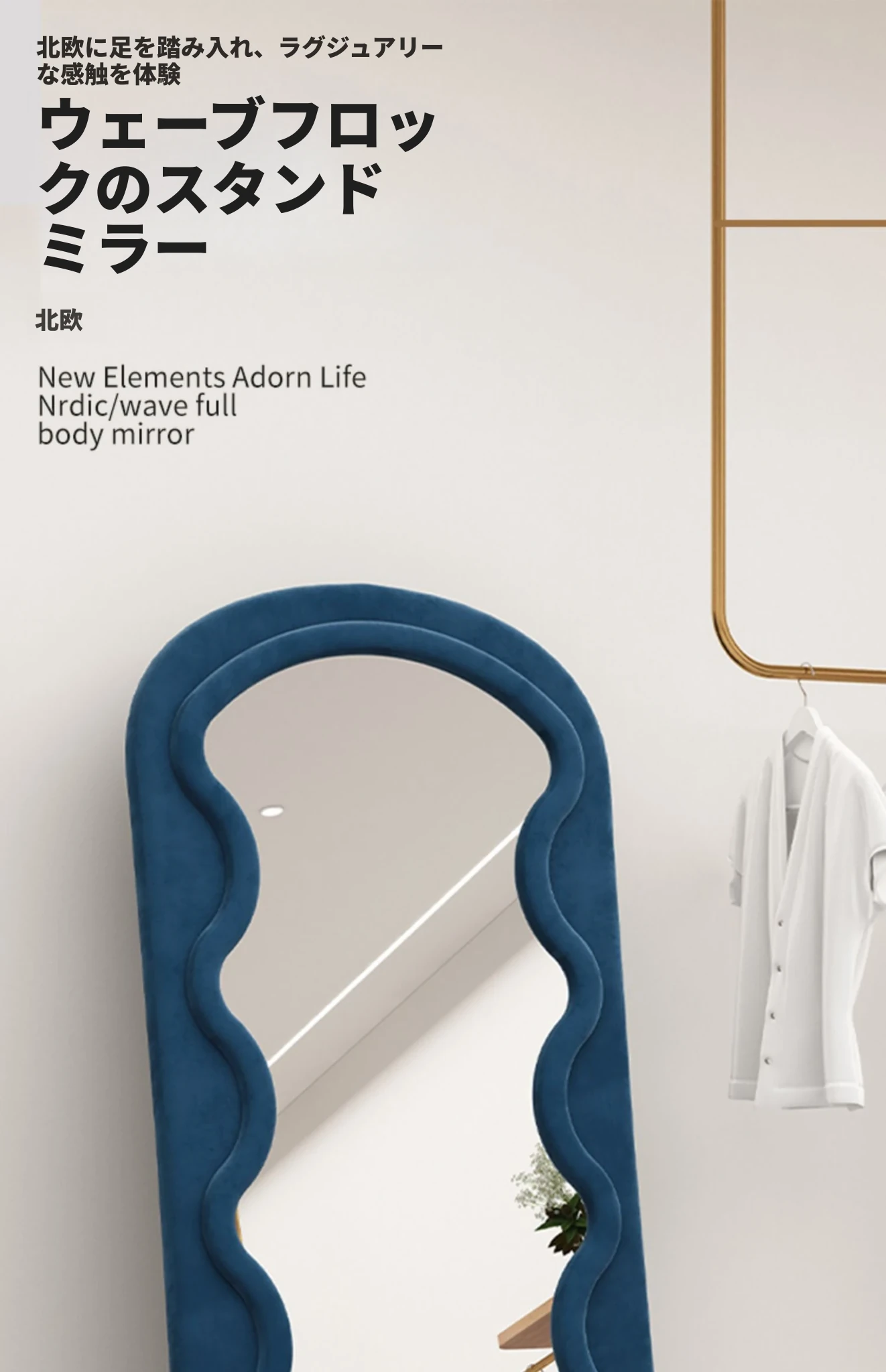 おしゃれな波浪デザインの全身鏡!自宅用のスタンドタイプで、女性のメイクやコーディネートにぴったり。壁に寄せて使えるユニークな形状で、衣類店の試着にも最適です。あなたの美しさを引き立てるアイテム!