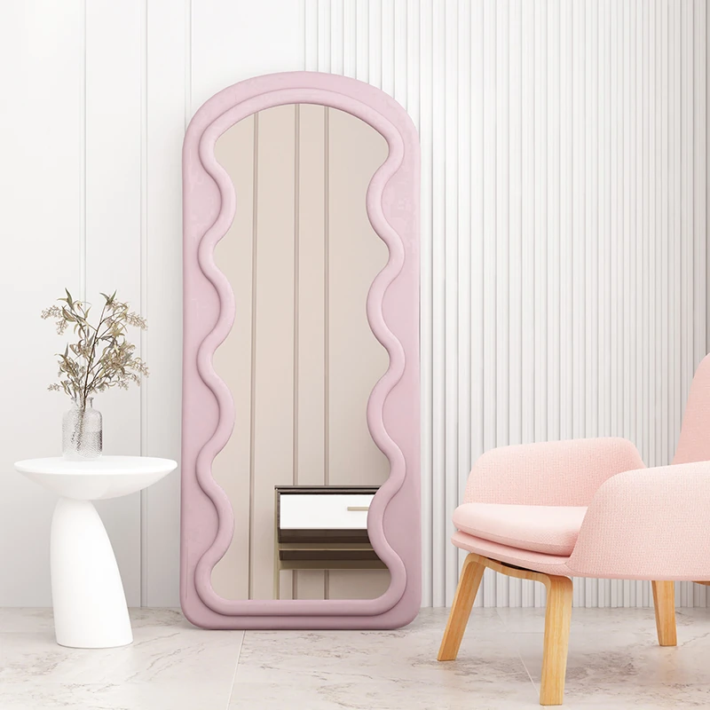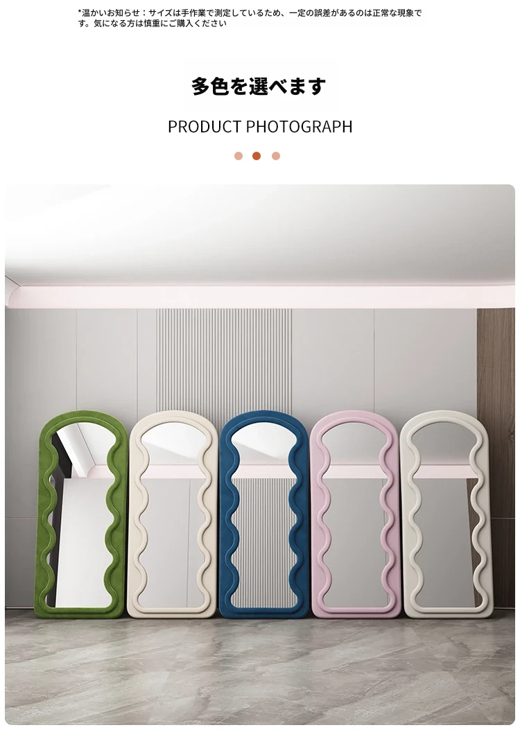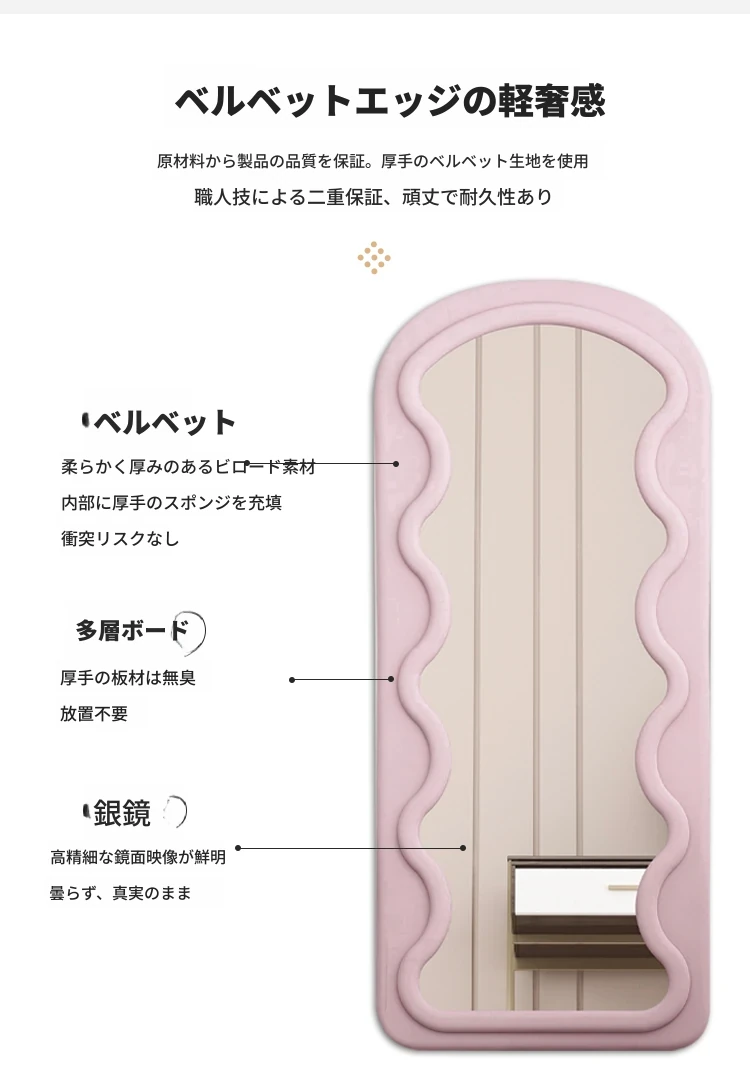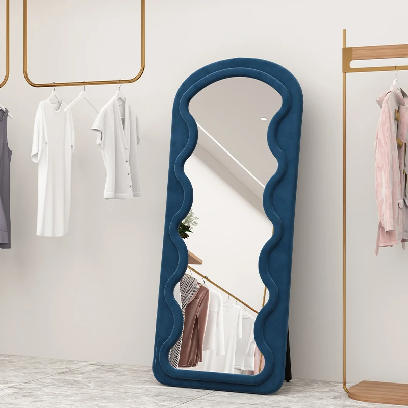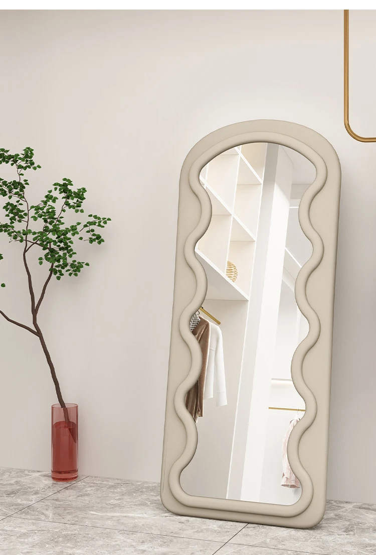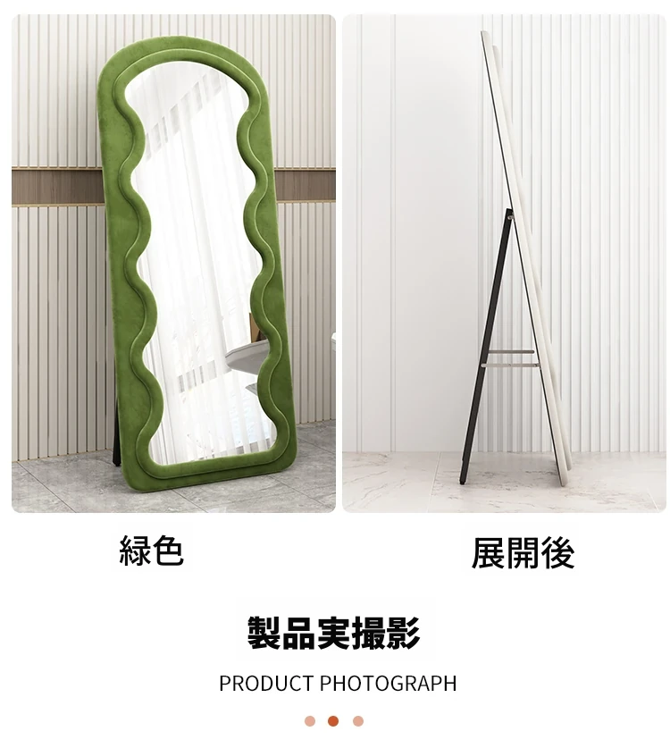 おしゃれな波浪デザインの全身鏡!自宅用のスタンドタイプで、女性のメイクやコーディネートにぴったり。壁に寄せて使えるユニークな形状で、衣類店の試着にも最適です。あなたの美しさを引き立てるアイテム!