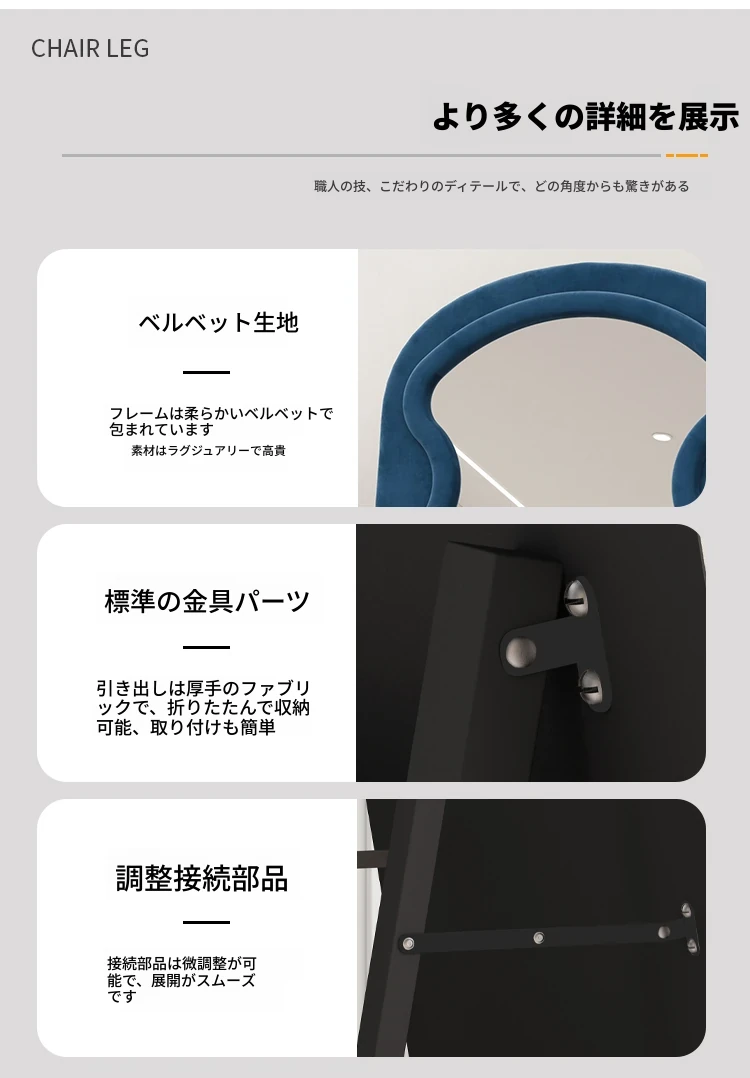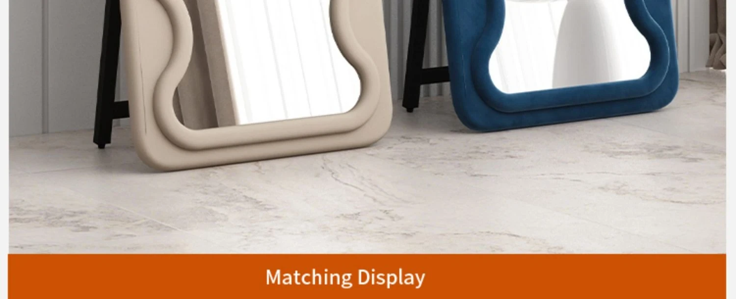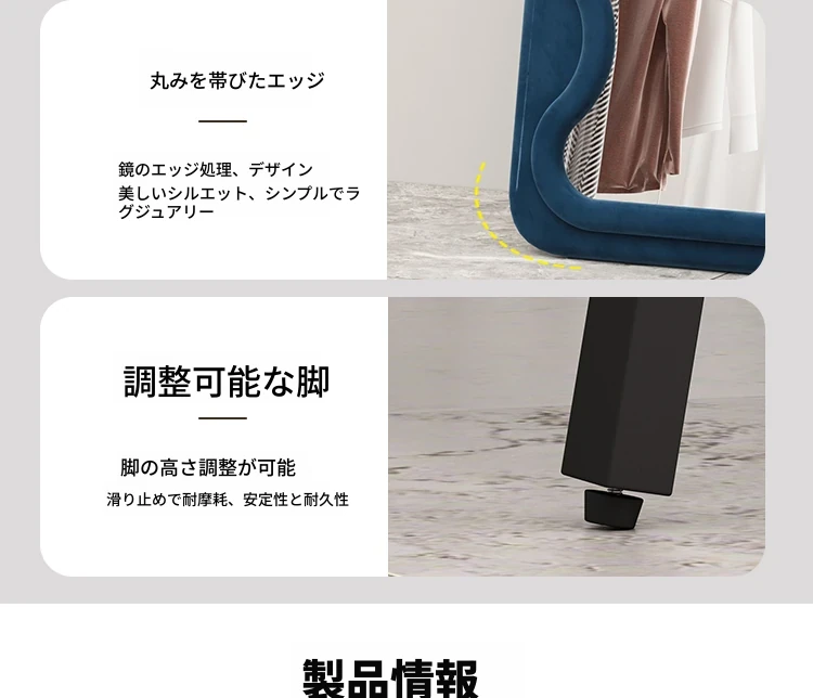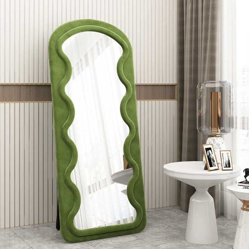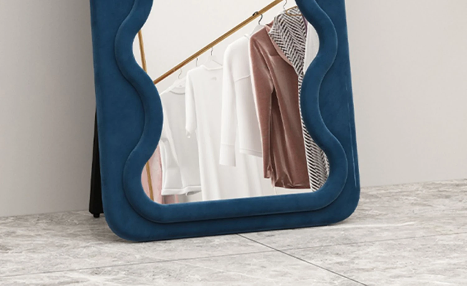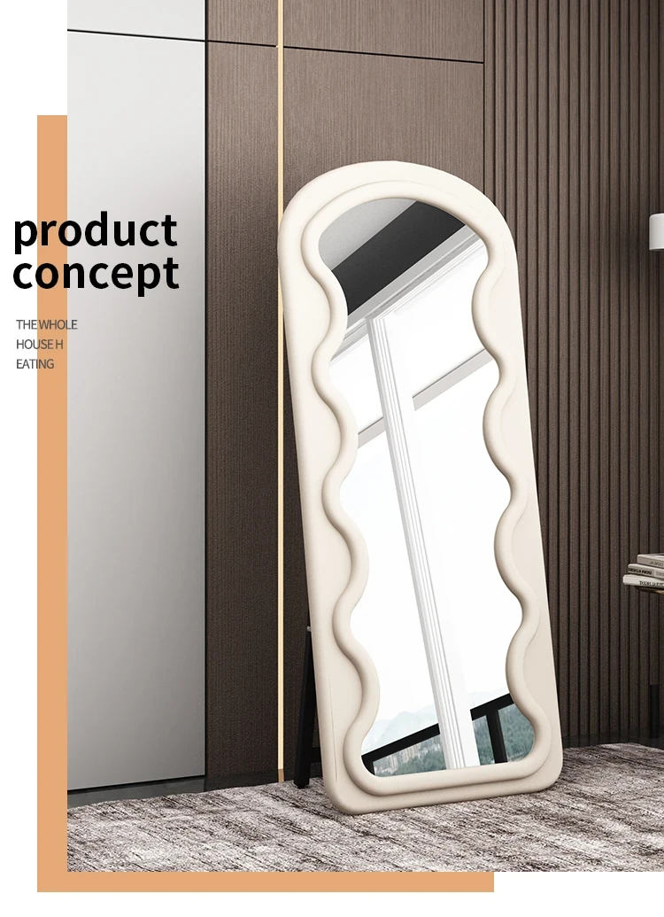 おしゃれな波浪デザインの全身鏡!自宅用のスタンドタイプで、女性のメイクやコーディネートにぴったり。壁に寄せて使えるユニークな形状で、衣類店の試着にも最適です。あなたの美しさを引き立てるアイテム!